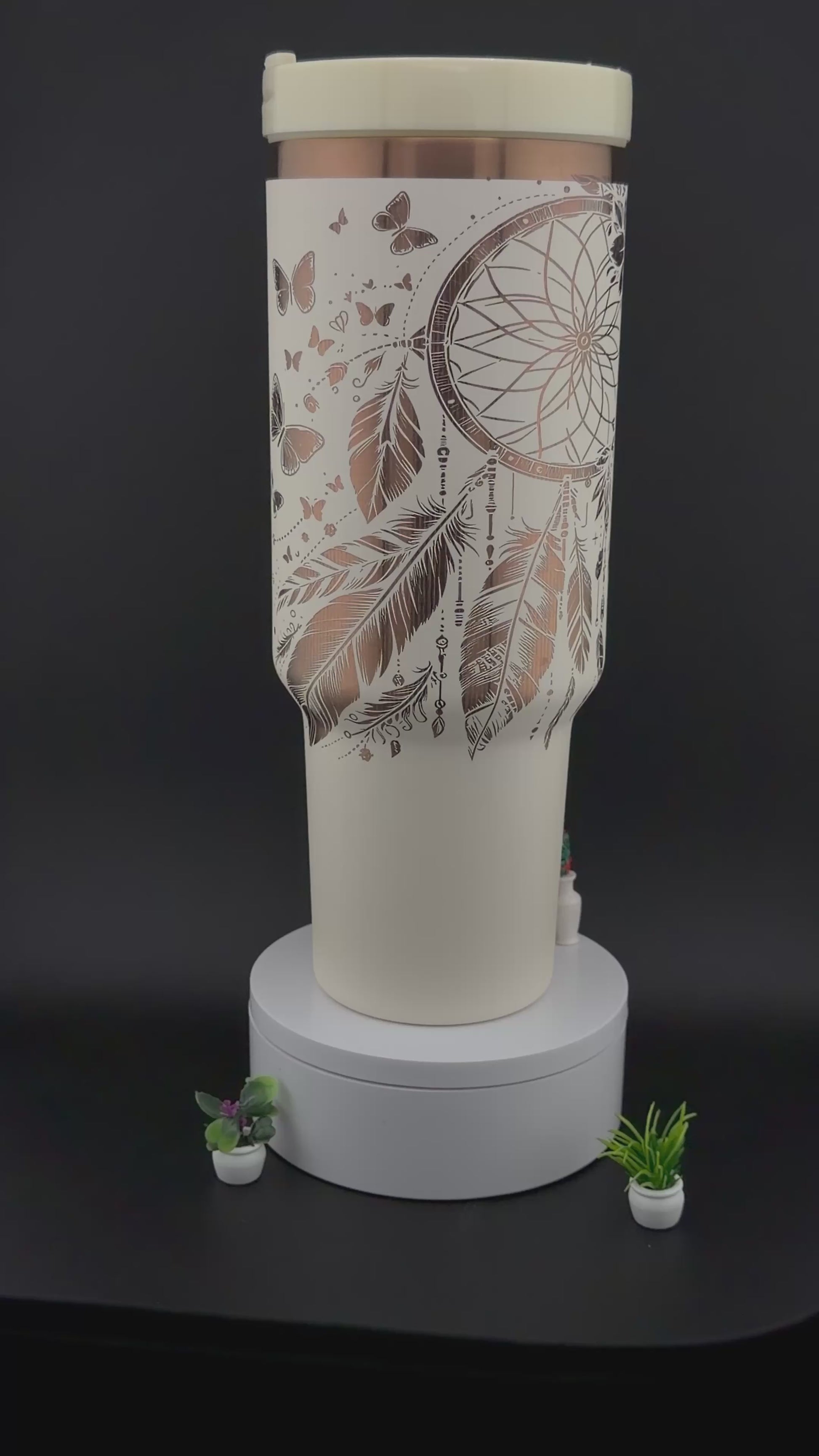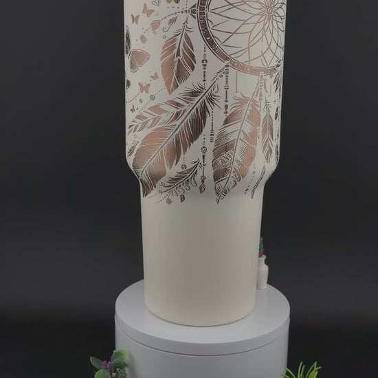 Catch your dreams and carry them with you. This 40 oz stainless steel bronze plated tumbler features a beautifully crafted laser engraved dreamcatcher, symbolizing protection, hope and harmony. With its generous capacity and double-wall insulation, it keeps your drinks hot or cold for hours while the intricate engraving adds a touch of artistry and meaning to your everyday hydration. Limited supply